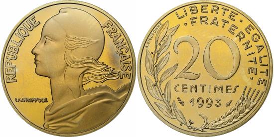 | | France, 20 Centimes, Marianne, 1993, Paris, Proof, Aluminum-Bronze, | | | Marianne, Liberty bust left, Denomination above date, grain sprig below, laurel branch at left, Without mint mark. 1991-1993 dated coins, non-Proof, exist in both coin and medal alignment., Henri Lagriffoul | | FEATURES |