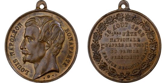 | France, Medal, Louis Napoléon Bonaparte, 1ère Fête Nationale, 1852, Copper |