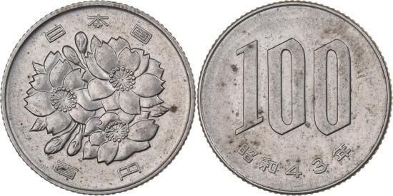 | | Japan, Hirohito, 100 Yen, Yr.43(1968), Copper-nickel, , KM:82 | | | Cherry blossoms, Large numeral 100 in center | | FEATURES |