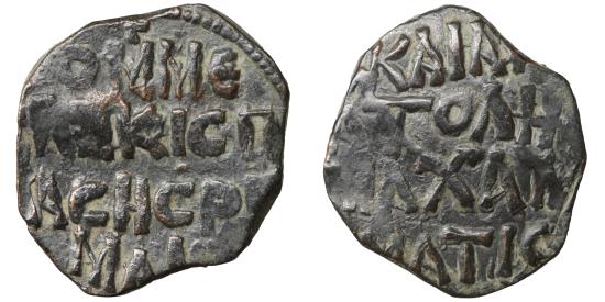 ISLAMIC, Anatolia & al-Jazira (Post-Seljuk). Danishmendids (Sivas). Malik Muhammad. AH 528-536 / AD 1134-1142. Æ Dirham (22mm, 7.2 g)). [OME]/ΛΗKI[C/ P]ACHC Pω/MANI[AC] / KAI AN/ATOΛHE/ [M]AXAM/[ATIC]. Whelan Type A; CMM 1941; Album 1238 (RR). VF+ brown patina.