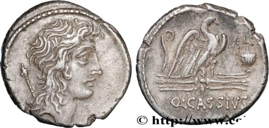 Q. CASSIVS Aigle debout à droite sur un foudre, les ailes déployées, entre un lituus dans le champ à gauche et un capis (vase) dans le champ à droite
