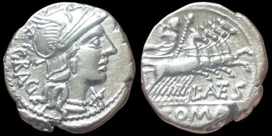 L. Antestius Gragulus, 136 BC. Denarius (Silver, 19 mm, 4.02 g), Rome. Obv.: GRAG Helmeted head of Roma to right; below chin, XVI monogram in ligature (mark of value). Rev.: L · (ANTE)S / ROMA Jupiter in quadriga galloping to right, hurling thunderbolt with his right hand and holding scepter in his left. Babelon (Antestia) 9. Crawford 238/1. RBW 980. Sydenham 451. |