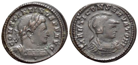 Constantine I (307/310-337). Æ Follis (24mm, 4.59 g, 6h). Treveri (Trier) mint. Struck AD 310-313. Laureate and cuirassed bust right R/ Helmeted and cuirassed bust of Mars right. RIC VI 881. VF, brown patina with touches of verdigris on the obverse. From the Collection of a Director. . Good VF