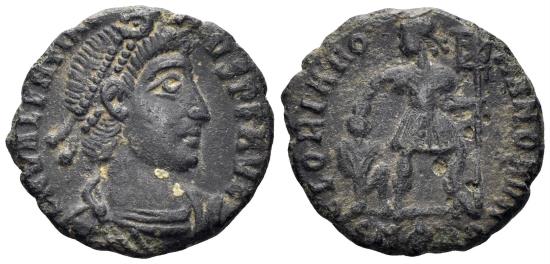 Valentinian I. 364-375 AD. AE3 (2.31g, 17mm). Rome mint. Struck 367-75 AD. Obv.: D N VALENTINIANVS P F AVG, diademed, draped and cuirassed bust right. Rev.: GLORIA ROMANORVM, emperor advancing right, dragging captive with his right hand and holding labarum with his left; SM(ivy leaf)RP in exergue. LRBC 721. VF.