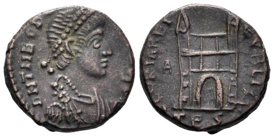 Theodosius I the Great. 379-395 AD. AE Nummus (1.47g, 12mm). Thessalonica mint. Struck 383-8 AD. Obv.: DN THEODO[SIVS P F A]VG, pearl-diademed, draped and cuirassed bust to right. Rev.: [GLORIA REIP]VBLICE, camp gate; TES in exergue. RIC 62b.1. gVF.