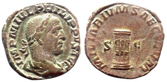 IMP M IVL PHILIPPVS AVG, laureate, draped and cuirassed bust right / MILIARIVM SAECVLVM, low column inscribed COS III; S-C across fields.