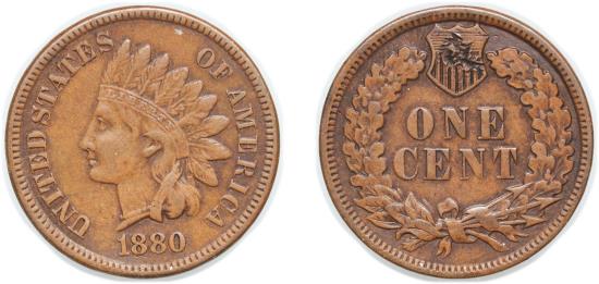United States Federal republic 1880 1 Cent "Indian Head Cent" Bronze (.950 copper, .050 tin and zinc) Philadelphia Mint (38961000) 3.08g XF KM 90a Schön 117a
