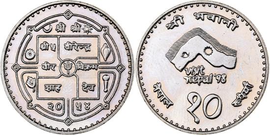 | | Nepal, SHAH DYNASTY, Birendra Bir Bikram, 10 Rupee, 1997, Kathmandu | | | Traditional design, Moon and sun flanking mountaintop | | FEATURES |