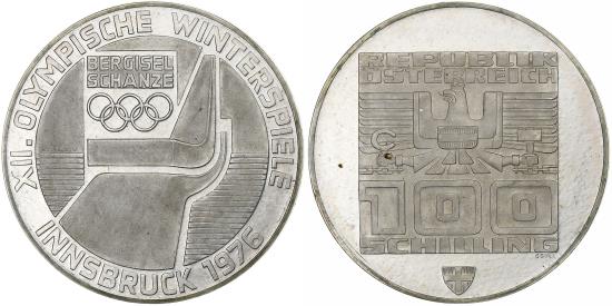 | | Austria, 100 Schilling, 1976, Vienna, Proof, Silver, , KM:2929 | | | Box surrounds stylized Imperial Eagle, Austrian shield on breast, above value, small shield below box, Ski jump, Olympic logo upper left, circle surrounds, date lower right | | FEATURES |