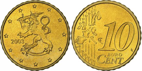 | | Finland, 10 Euro Cent, 2003, Vantaa, Brass, , KM:101 | | | Rampant lion left surrounded by stars, date at left, Denomination and map, Heikki H | | FEATURES |