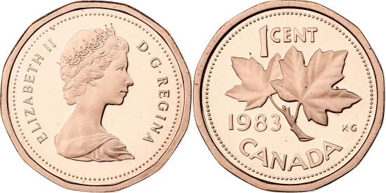 | | Canada, Elizabeth II, Cent, 1983, Royal Canadian Mint, Bronze, , KM:132 | | | Queen's bust right, Maple leaf divides date and denomination, Reduced weight., Arnold Machin | | FEATURES |