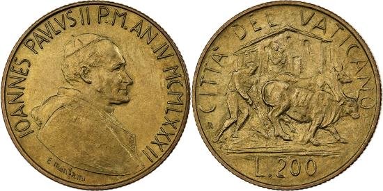| | VATICAN CITY, John Paul II, 200 Lire, 1982 (Anno IV), Rome, Aluminum-Bronze | | | Bust right, Workers and ox | | FEATURES |