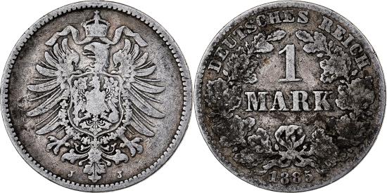 | | GERMANY - EMPIRE, Mark, 1885, Hambourg, KM #7, , Silver, 24, 5.42 | | | Denomination within wreath, Crowned imperial eagle | | FEATURES |