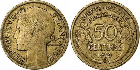 | | France, 50 Centimes, Morlon, 1939, Brussels, Aluminum-Bronze, | | | Morlon, Laureate head left, Denomination above date, cornucopias flank | | FEATURES |