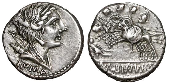 A. ALBINUS SP. F. AR DENARIUS Rome Mint 96 BC Obverse: Bust of Diana to right, with bow and quiver over shoulder; ROMA below Reverse: Three horsemen galloping to left, trampling fallen warrior; A ALBINVS SF in exergue References: Crawford 335/9; BMCRR Italy 713; RSC Postumia 4 Size: 19mm, 3.86g Professional Numismatic Notes: Exquisite example with choice detail and a splendid old-collection tone!