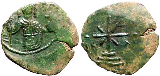 Half-length figure of Manuel facing, wearing crown and loros, and holding labarum and globe-cross.