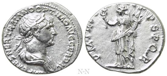 Obv: IMP CAES NER TRAIANO OPTIMO AVG GER DAC.Laureate and draped bust right.Rev: P M TR P COS VI P P SPQR.Felicitas standing left, holding caduceus and cornucopia.