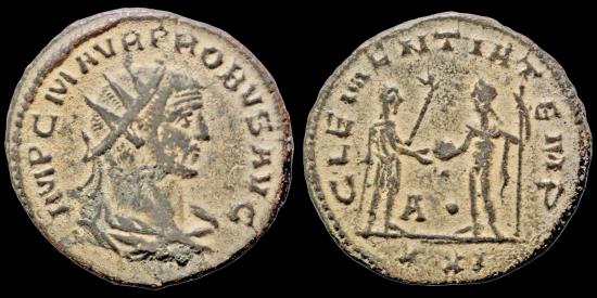 Probus (276-284AD) AE antoninianus- 3,58 gram- 21 mm,Antioch mint obv: IMP C M AVR PROBVS P F AVG, radiate, draped and cuirassed bust right rev: CLEMENTIA TEMP, emperor standing right, holding sceptre, receiving Victory on globe from Jupiter standing left, holding sceptre, A. in lower center, XXI in exergue RIC 921 |