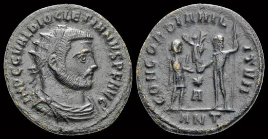 Diocletian (284-305AD) AE radiate- 3,24 gram, Antioch mint, struck 296AD obv: IMP C C VAL DIOCLETIANVS AVG, radiate, draped and cuirassed bust right rev: CONCORDIA MILITVM, emperor standing right in military dress, receiving Victory on globe from Jupiter facing left, leaning on sceptre,* above A in lower centre, ANT in exergue RIC p 621, 60 (a) |