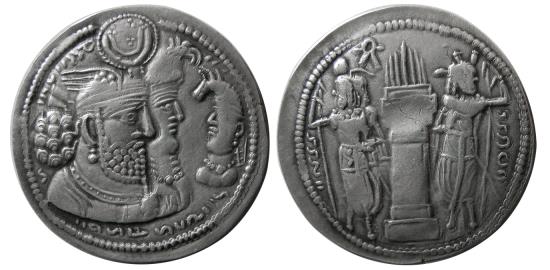 PCW-S1965-SASANIAN KINGS, Vahram (Bahram) II and family. 276-293 AD. AR Drachm (3.91 gm; 27 mm). Jugate busts of Bahram, wearing winged crown with korymbos, and his queen, wearing kolah with boar’s head, right, vis-a-vis bust of Prince 4, wearing kolah with eagle’s head, reverse, fire altar with attendants, with symbol “Faravahar” on the left of flame. SNS type VI/1 var.; Gobl type VII/2a; Saeedi 166 corr. (rev. type); Sunrise 786. Choice Good VF. Toned. |