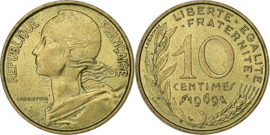 | | France, 10 Centimes, Marianne, 1969, Paris, Aluminum-Bronze, | | | Marianne, Liberty bust left, Denomination above date, grain sprig below, laurel branch at left, Without mint mark. 1991-1993 dated coins, non-Proof, exist in both coin and medal alignment., Henri Lagriffoul | | FEATURES |