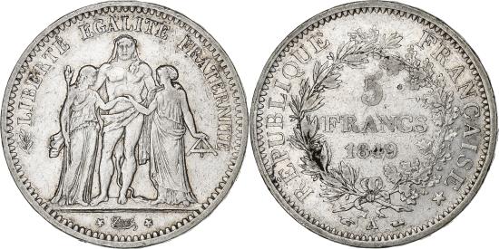 | | France, 5 Francs, Hercule, 1849, Paris, Silver, , Gadoury:683, KM:756.1 | | | Hercule, Hercules group, Denomination within wreath | | FEATURES |