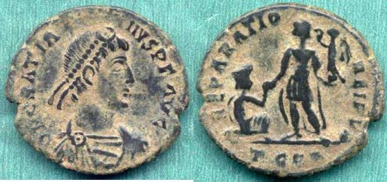 AE 24mm, 4.7 grams FOLLIS O: Gratian bust facing right R: Gratian raising kneeling supplicant, he holds Victory on globe REPARATIO REIPVB