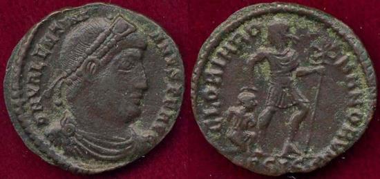 AE 18mm, 2.07 grams Centenionalis O:DN VALENTINI, bust facing right R:GLORIA ROMANORVM, Valentinian advancing r., dragging captive by the hair. He holds a labarum in left hand VERY GOOD EYE APPEAL