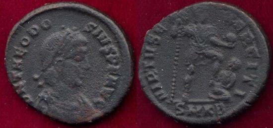 AE 23mm, 6.58 grams Maiorina O:DN THEODOSIVS PF AVG, bust facing right R:Theodosius in military attire stg. r. holding standard & globe, foot set on captive SMKB in exergue VIRTVS EXERCITI