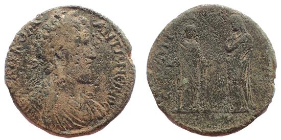 | Ionia. Samos. Commodus (180-193). Ae 33 mm. 19.1 gm. Obv: Μ ΑΥΡ ΚΟΜ ΑΝΤΩΝƐΙΝΟϹ; laureate-headed bust of Commodus (long beard) wearing cuirass and paludamentum, r., seen from front Rev: ϹΑΜΙΩΝ; to l., cult statue of Samian Hera facing, wearing kalathos entwined by serpent, holding patera in each hand, having fillets; to r., veiled Nemesis standing, facing, plucking chiton. BMC 242. RPC IV.2, 1058 (temporary) (4 specimens) Very Rare. |
