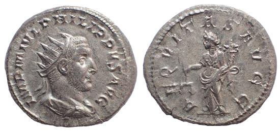 Philip I. AD 244-249. AR Antoninianus 23 mm. 4.2 gm. Rome mint, 2nd officina. 5th emission, AD 246. Obv: IMP M IVL PHILIPPVS AVG, Radiate, draped, and cuirassed bust right. Rev: AEQVITAS AVGG, Aequitas standing facing, head left, holding scales and cornucopia. RIC IV 27b; RSC 9.
