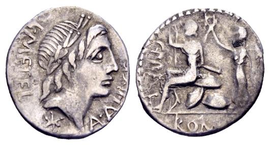 | Roman Republic. C. Publicius Malleolus, A. Postumius Albinus and L. Metellus, AR Denarius (19mm, 3.74 g) Rome 96 BC |