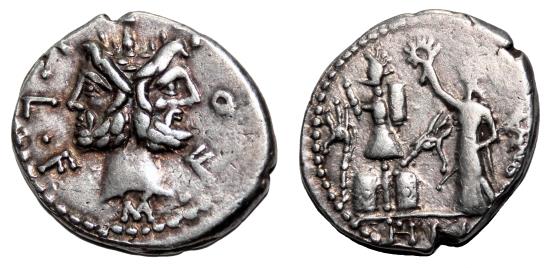 Obverse: M. FOVRI. L.F. Laureate head of Janus. Reverse: Roma standing left, holding sceptre in Ieft hand and crowning trophy with right hand, the trophy is sumounted by a helmet and flanked by two carnyx and shields on each side, above star, behind ROMA on right, PHILI (PH interlace), in exergue. Very nice specimen of this interesting issue, in EF-/VF+ condition, conserving complete details on both sides, bold reliefs checkable at photo and good quality silver. Crawford 281/1. Rome mint, 119 BC. 3,9 g - 19,5 mm -------------------------------------------------------------------------------------------------- Visit our site about Numismatics and Archaeology: aeternitas-numismatics.com |
