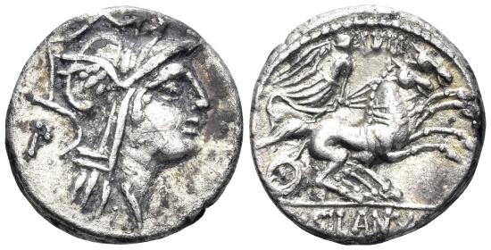 D. Silanus L. F. 91 BC. AR Denarius (3.60g, 16mm). Rome mint. Obv.: helmeted head of Roma right, behind, P. Rev.: Victory in biga right, holding palm branch and reins in left hand and whip in right, above, VIII; D·SILANVS·L·F ROMA in exergue. Babelon Junia 15 var.; Sydenham 646a var.; Russo RBW 1233 var.; Crawford 337/3 var. Deposits, VF. |