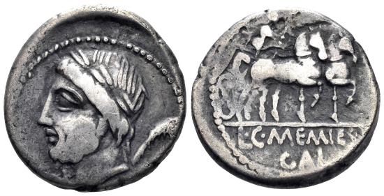 L. C. Memies L. F. Galeria. 87 BC. AR Denarius (3.82g, 17mm). Rome mint. Obv.: laureate head of Saturn left; behind, harpa; below, [EX S C]. Rev.: Venus in biga right; above, Cupid holding wreath; L C MEMIES [L F] / GAL in exergue. Crawford 349/1. Toned aVF.
