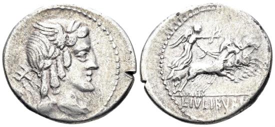L. Julius Bursio. 85 BC. AR Denarius (3.71g, 20mm). Rome mint. Obv.: male head to right, with attributes of Apollo, Mercury and Neptune; bow and arrow behind. Rev.: Victory driving quadriga to right, holding reins and wreath; L•IVLI•BVRS[IO] in exergue. Crawford 352/1a; RSC Julia 5. Test on edge, VF.
