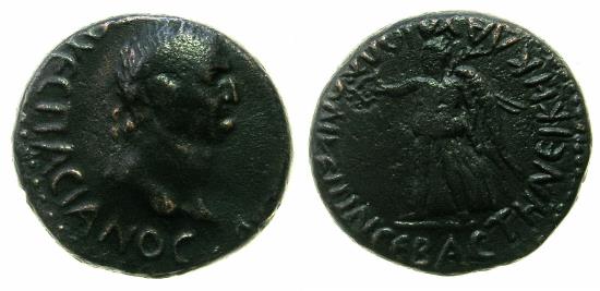 LYCONIA.Laodicea Katacecaumene.Vespasian AD 69-79.AE.22.6mm. ( 11.72g, 22.6mm, 12h ) (ΑΥΤΟΚΡΑΤωΡ ΚΑΙCΑΡ) ΟΥΕCΠΑΙCΑΝΟC, laurate bust of Vespasian right. Reverse.CEBACTH NEIKH ΚΛΑΥΔΙΟΛΑΟΔΙΚΙΕωΝ, Nike standing left holding wreath in outstretched right hand and palm branch in left. Ref:RPC II 1612 Better than very fine, obverse off centre strike, flan most probably cleaned in the past. Coin not photogenic, more pleasing to the eye in hand. |