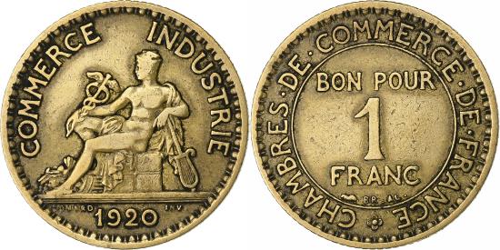 | | France, Franc, Chambre de commerce, 1920, Paris, Aluminum-Bronze, | | | Chambre de commerce, Value, Mercury seated left, Without mint mark. Chamber of Commerce., CHAMBRES <Bullet> DE <Bullet> COMMERCE <Bullet> DE <Bullet> FRANCE | | FEATURES |
