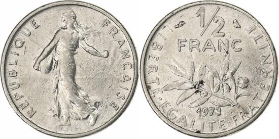 | | France, 1/2 Franc, Semeuse, 1973, Paris, Nickel, , Gadoury:429 | | | Semeuse, The Seed Sower, Laurel divides denomination and date, Without mint mark. | | FEATURES |