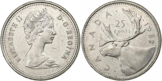 | | Canada, Elizabeth II, 25 Cents, 1982, Royal Canadian Mint, Nickel, | | | Small young bust right, Machin | | FEATURES |