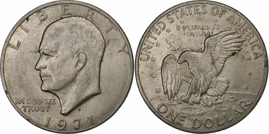 | | United States, Dollar, Eisenhower Dollar, 1971, Denver, Copper-Nickel Clad | | | Eisenhower Dollar, Eisenhower head on the left, Eagle landing on the moon, LIBERTY // 1971 // IN GOD WE / TRUST / D, UNITED STATES OF AMERICA // ONE DOLLAR // E.PLURIBUS / .UNUM. | | FEATURES |