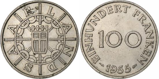 | | SAARLAND, 100 Franken, 1955, Paris, Copper-nickel, , KM:4 | | | Arms within circular design, Value and date | | FEATURES |
