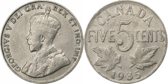 | | Canada, George V, 5 Cents, 1935, Royal Canadian Mint, Nickel, , KM:29 | | | King's bust left, Maple leaves divide denomination and date, E. B. MacKennal | | FEATURES |
