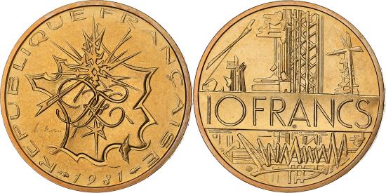 | | France, 10 Francs, Mathieu, 1981, Paris, Tranche A, Nickel-brass, | | | Mathieu, Stylized map of france, High tension towers and electric transmission wires, denomination at center | | FEATURES |