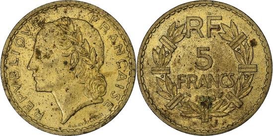 | | France, 5 Francs, Lavrillier, 1939, Aluminum-Bronze, , KM:888a.1 | | | Lavrillier, Laureate head left, Denomination above date within sectioned wreath, Struck for Colonial use in Algeria. | | FEATURES |