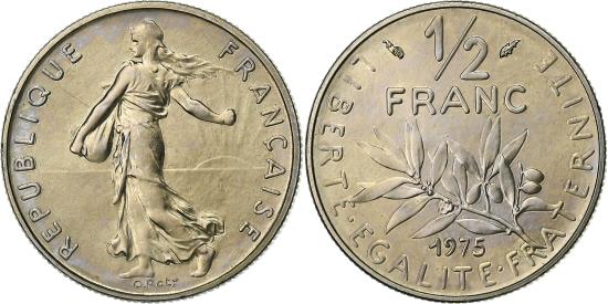 | | France, 1/2 Franc, Semeuse, 1975, Paris, FDC, Nickel, , Gadoury:429 | | | Semeuse, The Seed Sower, Laurel divides denomination and date, Without mint mark. | | FEATURES |