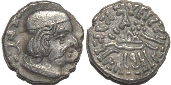 Rudrasimha II was either a usurper, or had to step in because the main line of kshatrapas did not have an heir. His coins name Swami Jivadaman as his father, a name that clearly is not royal. He commenced his coinage in the year 226, which was the last year of Visvasena, suggesting that he followed his predecessor, rather than beginning to serve as kshatrapa while Visvasena was still alive. Some authors believe he may have been a distant relative of the royal family. In any event, Rudrasimha II ruled from 226 to 238 and issued coins only as kshatrapa. Attractive portrait! Note the interesting, angular style of lettering ... well centered on reverse with full legend. A CHOICE specimen. |