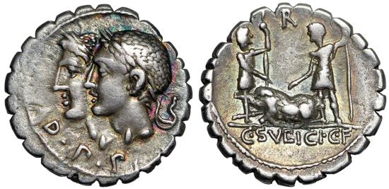 C. Sulpicius C.f. Galba AR Serrate Denarius Rome Mint 106 BC Obverse: Jugate laureate heads of Dei Penates left, both laureate Reverse: Two male figures, holding spears, pointing at sow at feet; R above; C SVLPICI C F in exergue References: 312/1 Size: 19mm, 3.91g Professional Numismatic Notes: Good very-fine with a stunning iridescence!