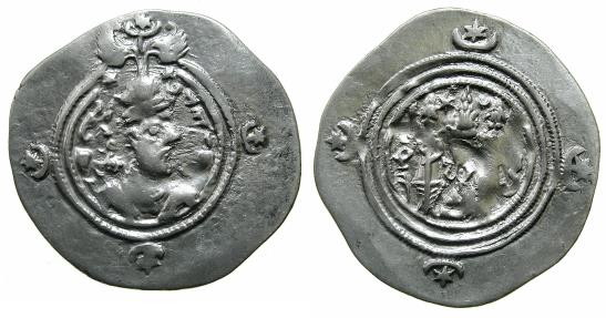 SASANIAN.Khusru ( Husrav ) II Parvis ( The Victorious ) 2nd reign AD 591-628.AR.Drachm. Regnal year 8 ( AD 598 ). mint WLC? ) unknown location ) ( 4.08g, 30.9mm, 3h ). Draped bust of Khusru II right wearing an elaborate winged mural crown with frontal crescent, kolymbos in crescent on right shoulder, crescent on left shoulder, outer circle star and crescent at 9,3 and 6 o'clock Reverse.Fire altar with ribbons flanked with a star and crescent, attendant either side, mint signature to right and regnal year, outer circle star and crescent at 9, 12, 3 and 6 o'clock. Ref:Gobl type II/3. Good very fine, some weak areas in strike, obverse some light porosity. The mint signature on this coin is not clear, the nearest match is WLC that remains unknown location |