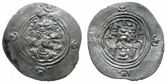 SASANIAN.Khusru ( Husrav ) II Parvis ( The Victorious ) 2nd reign AD 591-628.AR.Drachm. Regnal year 9 ( AD 599 ). mint AY ( uncertain probably Eran-xvarrah-Shapur (susa), Hezestan ) ( 4.06g, 30.9mm, 3h ). Draped bust of Khusru II right wearing an elaborate winged mural crown with frontal crescent, kolymbos in crescent on right shoulder, crescent on left shoulder, outer circle star and crescent at 9,3 and 6 o'clock Reverse.Fire altar with ribbons flanked with a star and crescent, attendant either side, mint signature to right and regnal year, outer circle star and crescent at 9, 12, 3 and 6 o'clock. Ref:Gobl type II/3. Good very fine, flan areas in strike. |
